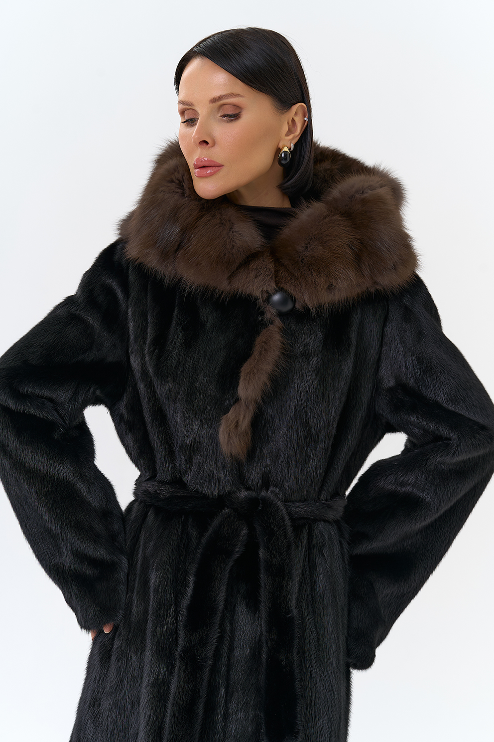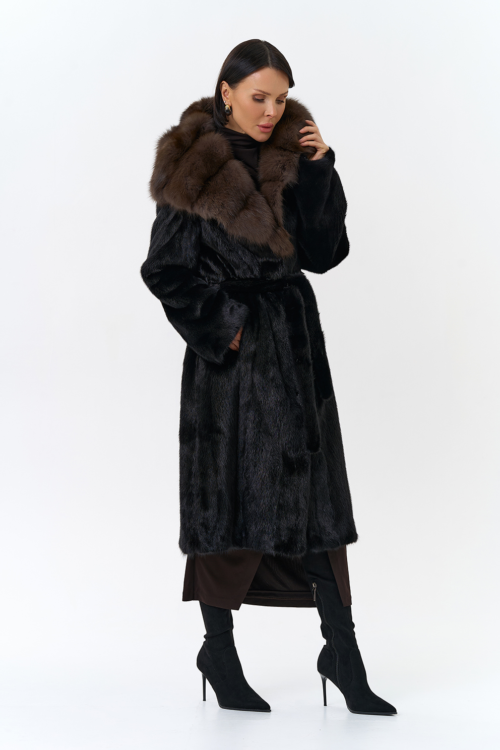 женщины. Капюшон выполнен с отделкой из куницы, что добавляет шубе роскоши.